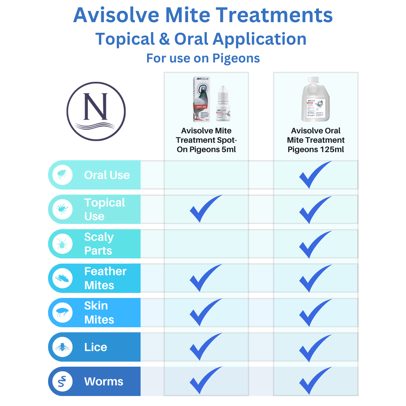 Suitable and safe for pigeons of all ages, Avisolve Oral does not harm young birds or affect fertility.